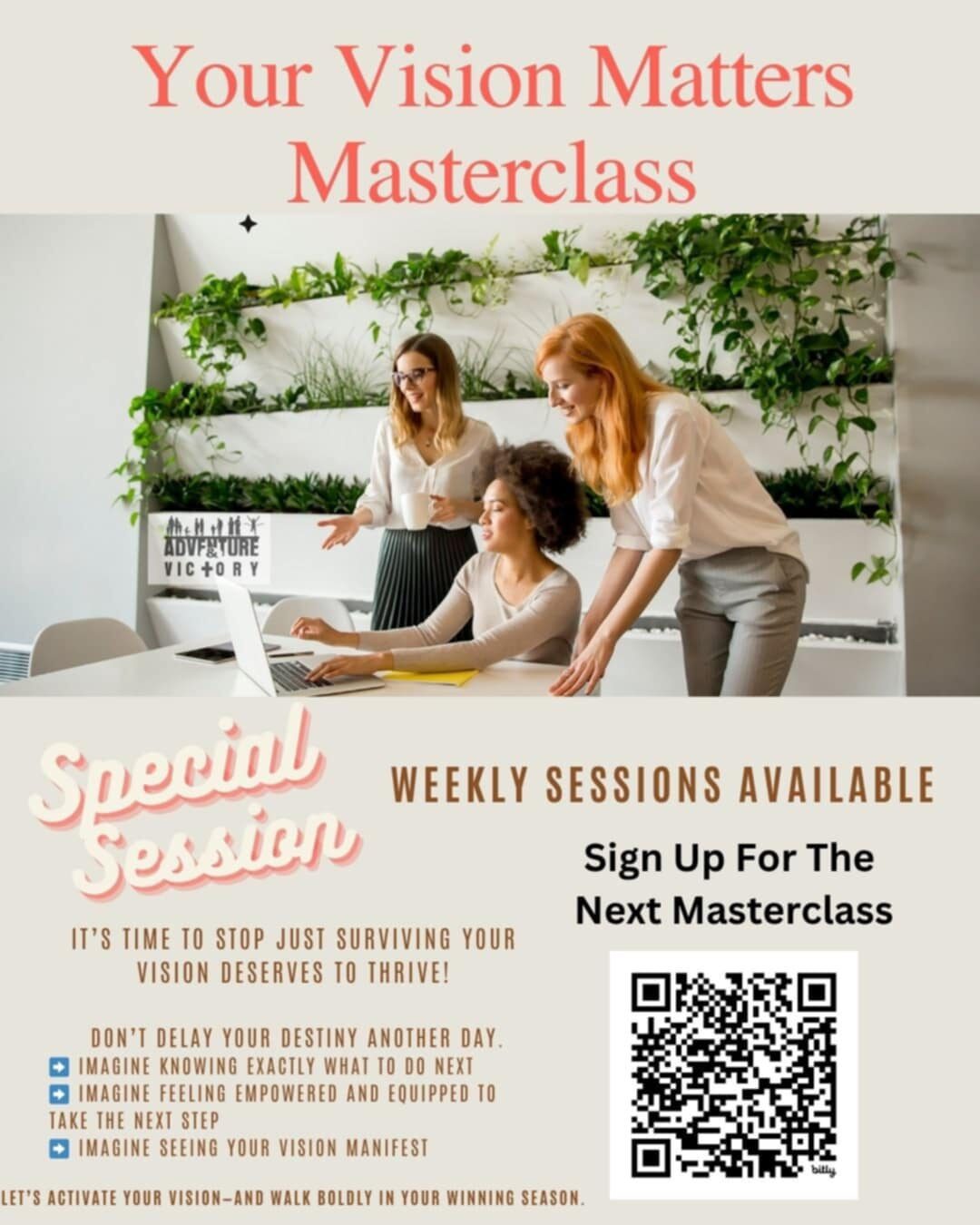 Women of Destiny mentoring and coaching. Your Vision Matters Masterclass is for you and has been designed to empower you with a level of unique training, to help you shift, and give yourself permission to get rid of all excuses, stop hiding, show up and speak up.