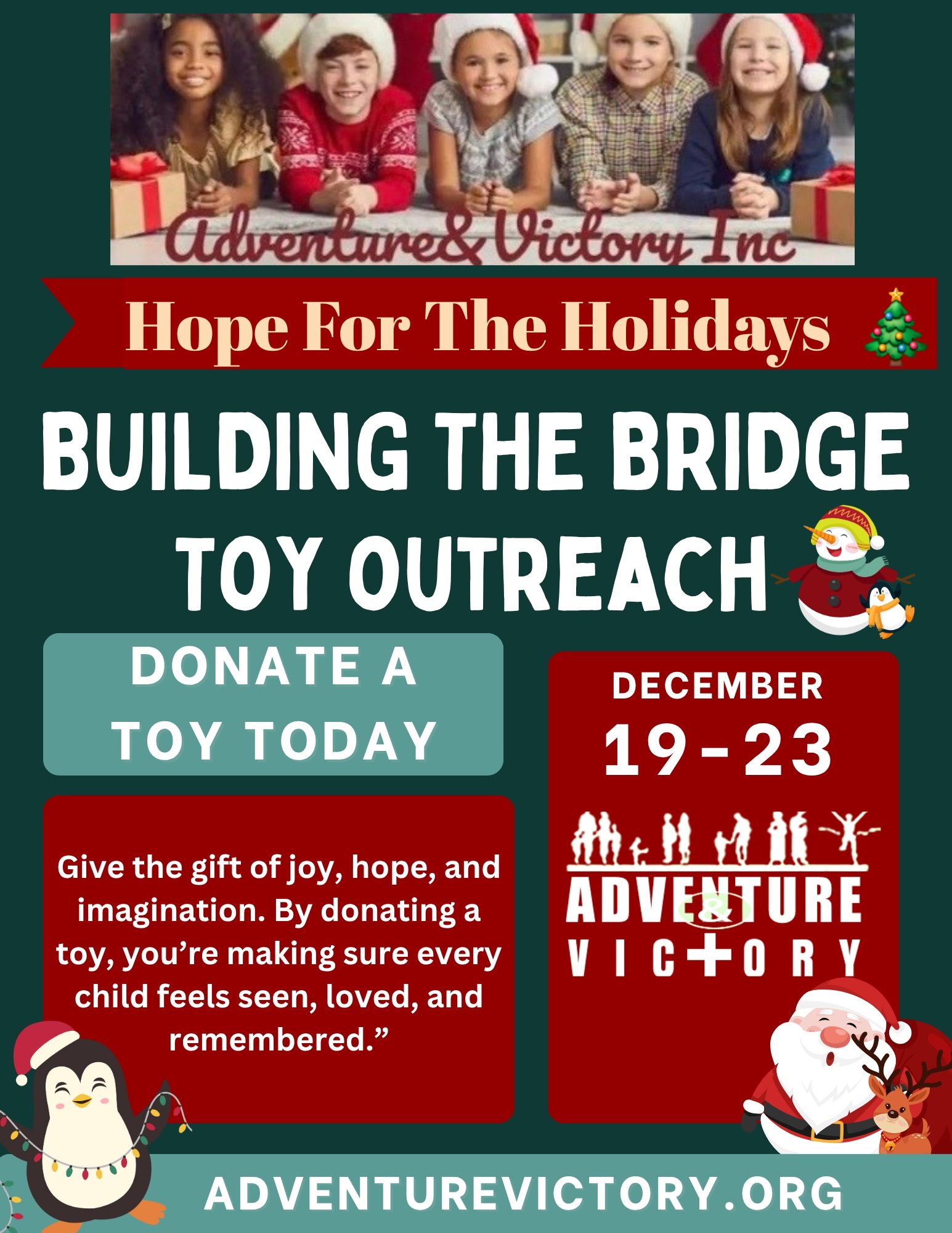 We would like to request your support of a tax-deductible donation for the ‘Building A Bridge Outreach Campaign ‘ which will assist us with rebuilding, transforming, and empowering the lives of those who are disadvantaged living right here in our own backyard and needing life skills to enhance their education, as well as their growth socially, emotionally, and economically in our community. Adventure Victory has been working tirelessly and has invested thirty years in the Dallas area community assisting with transforming the lives of individuals in need from a state of “Hopelessness to Hopefulness.” This is the mantra in which we have dedicated our efforts.